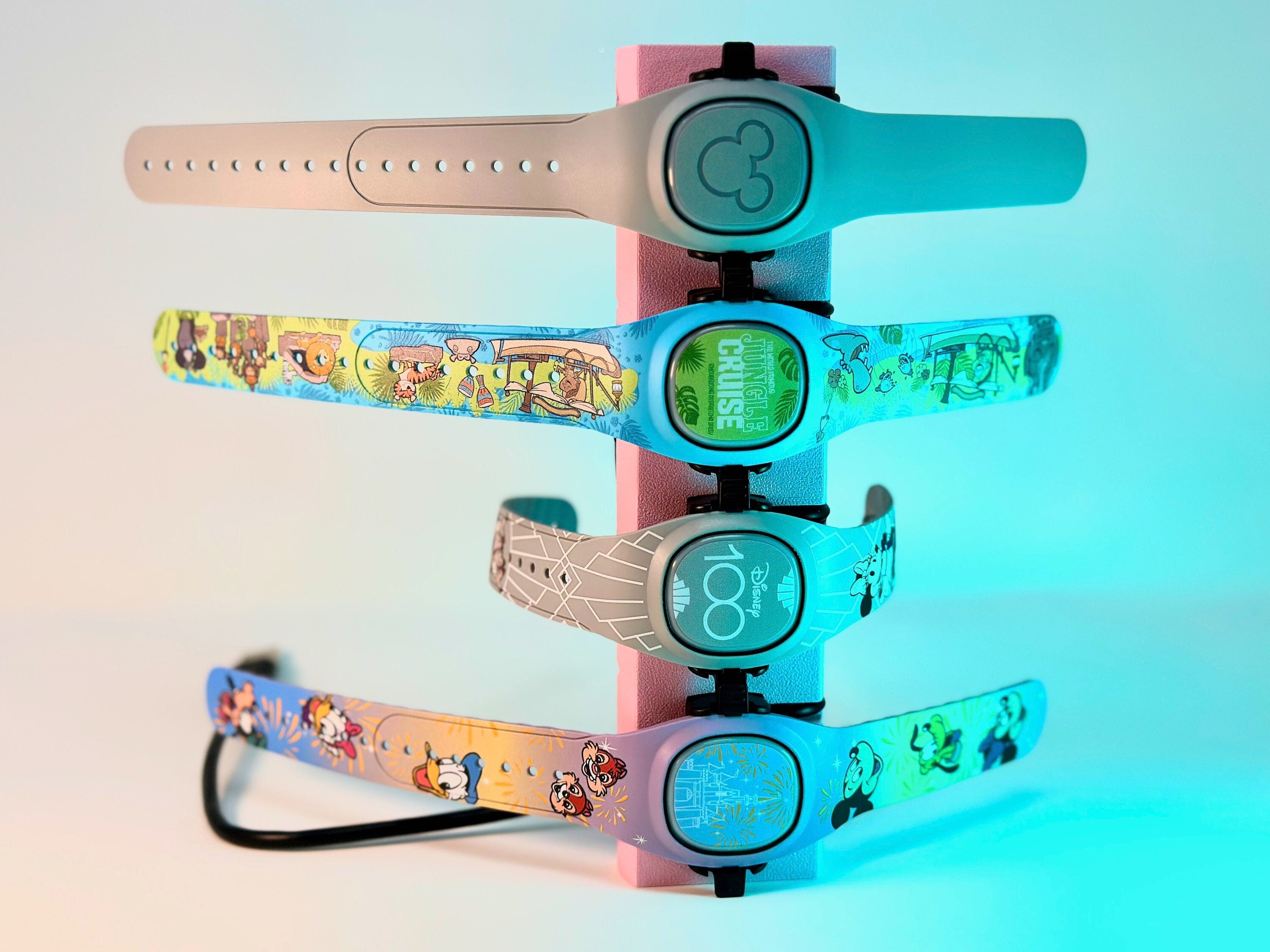 MagicBand+ Charging Towers are currently available in 3-, 4-, and 5-slot versions. Each Charging Tower can charge all connected MagicBands at the same time via the included USB hub.